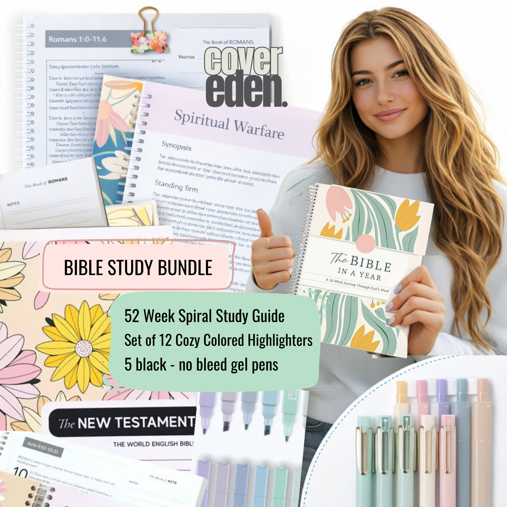 Ready to have all the right tools for your Yearl Long Bible Study? Get your bundle of the Cover Eden's Bible in a Year at 25% off regular cost with highlighters and gel pens. Normally $114 all together.