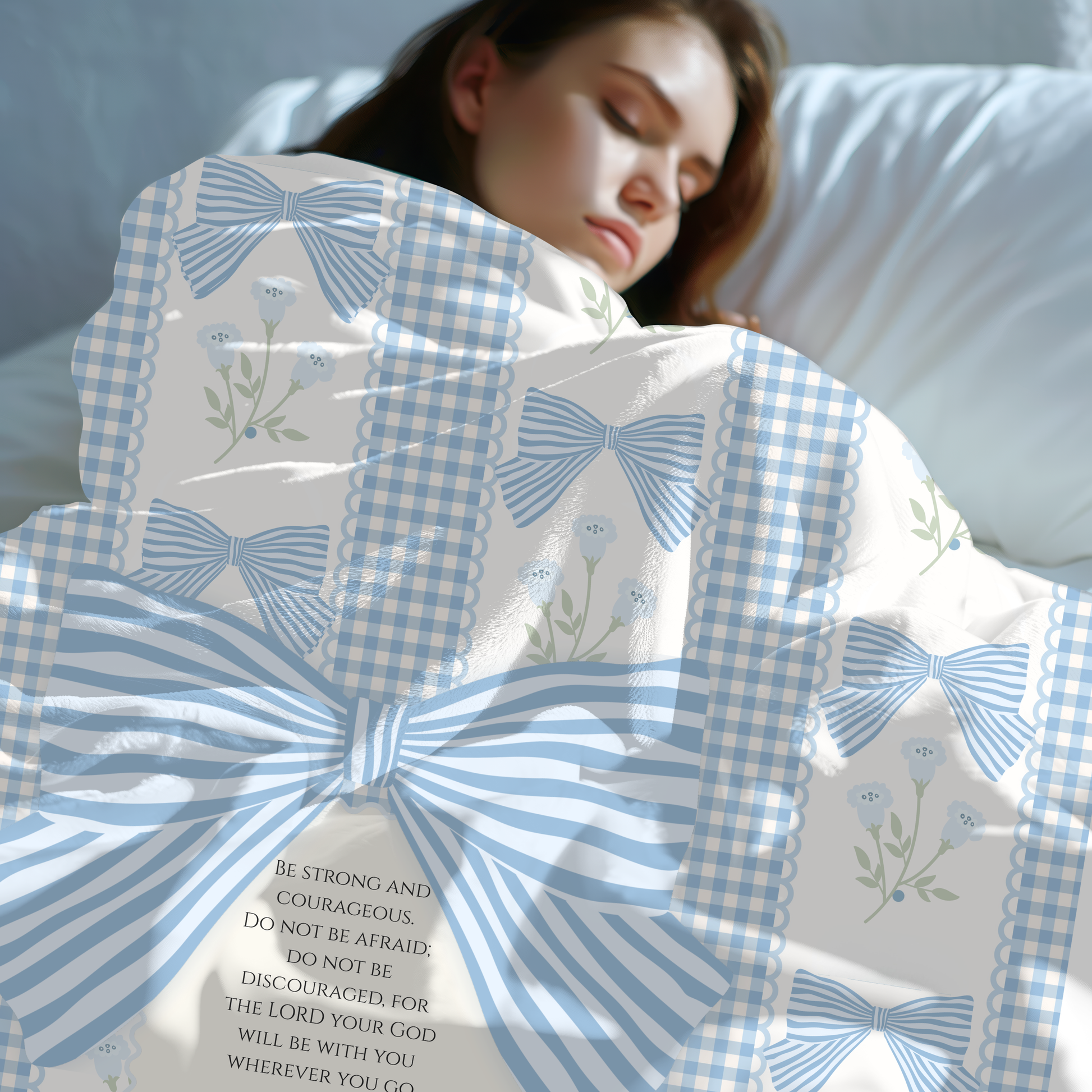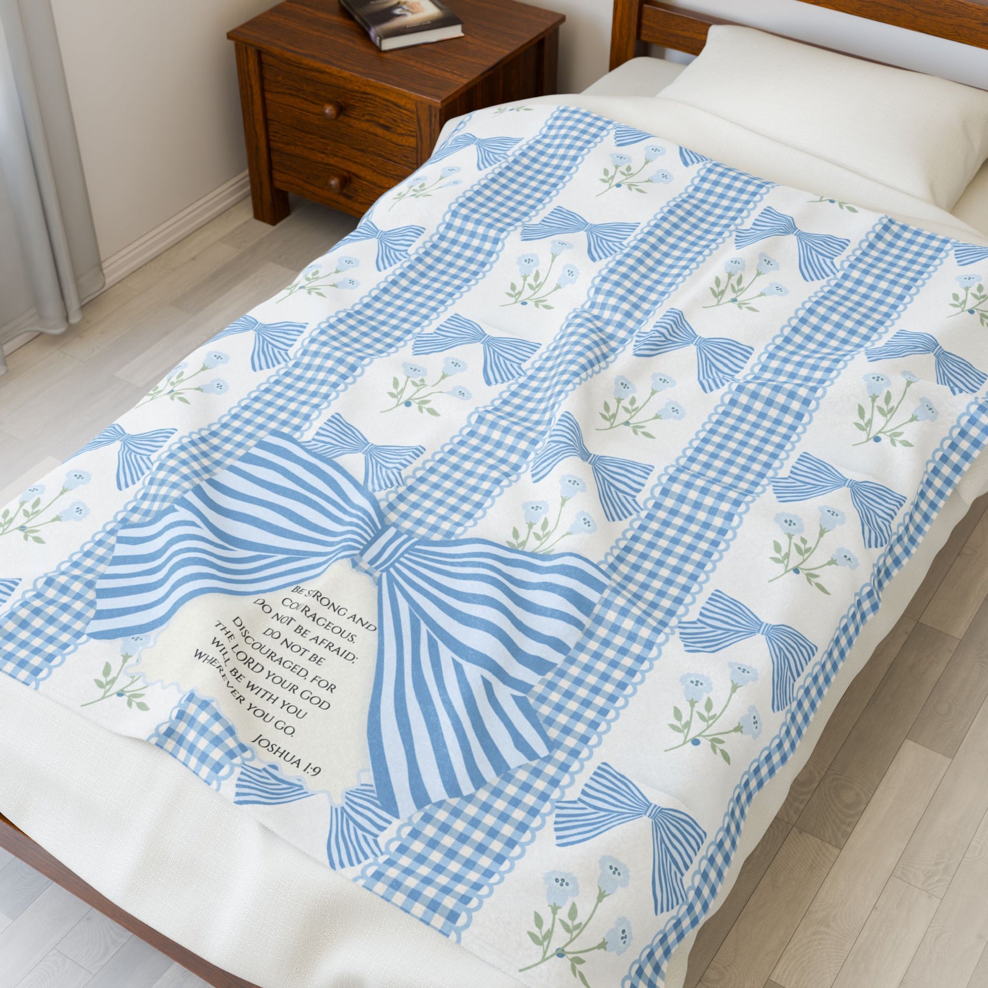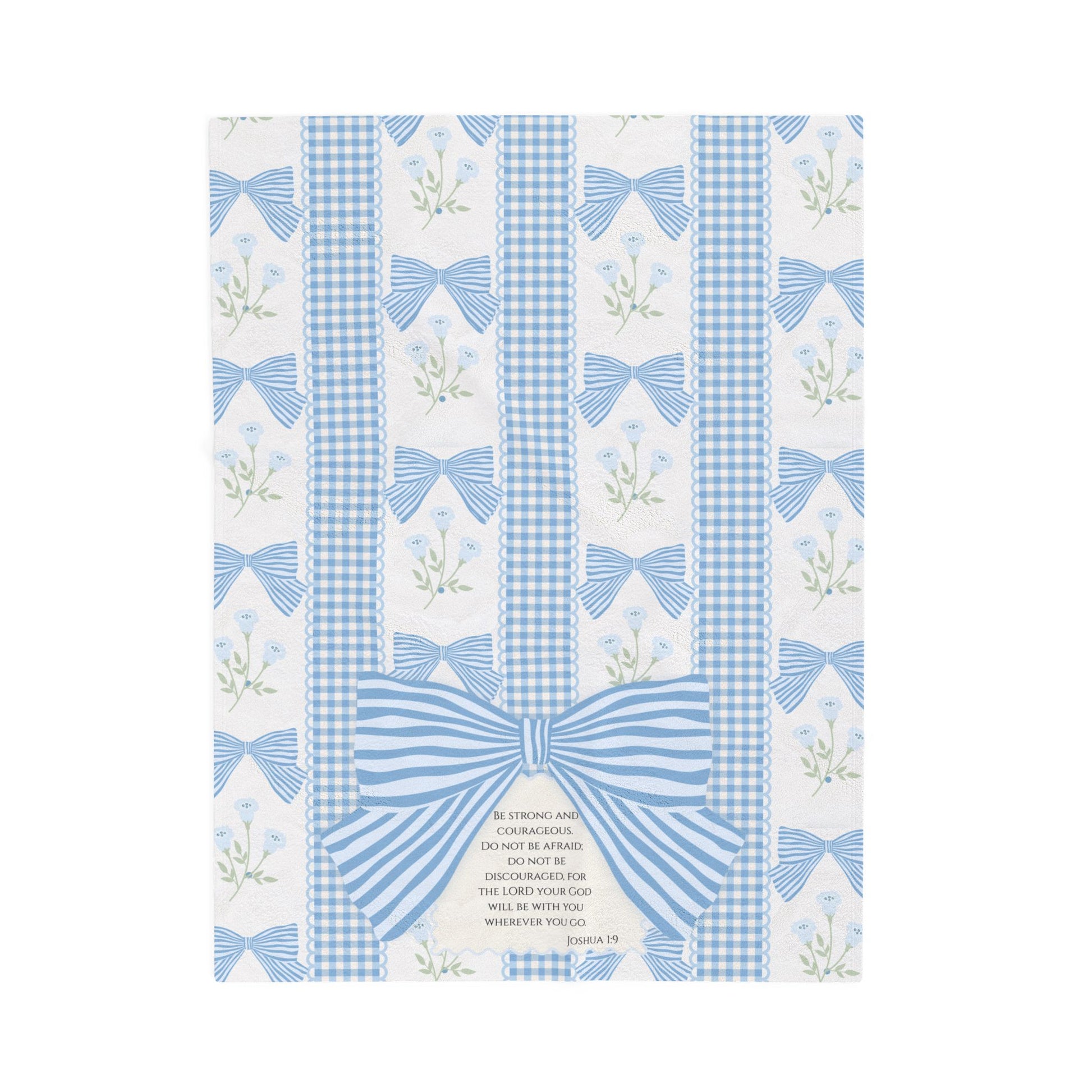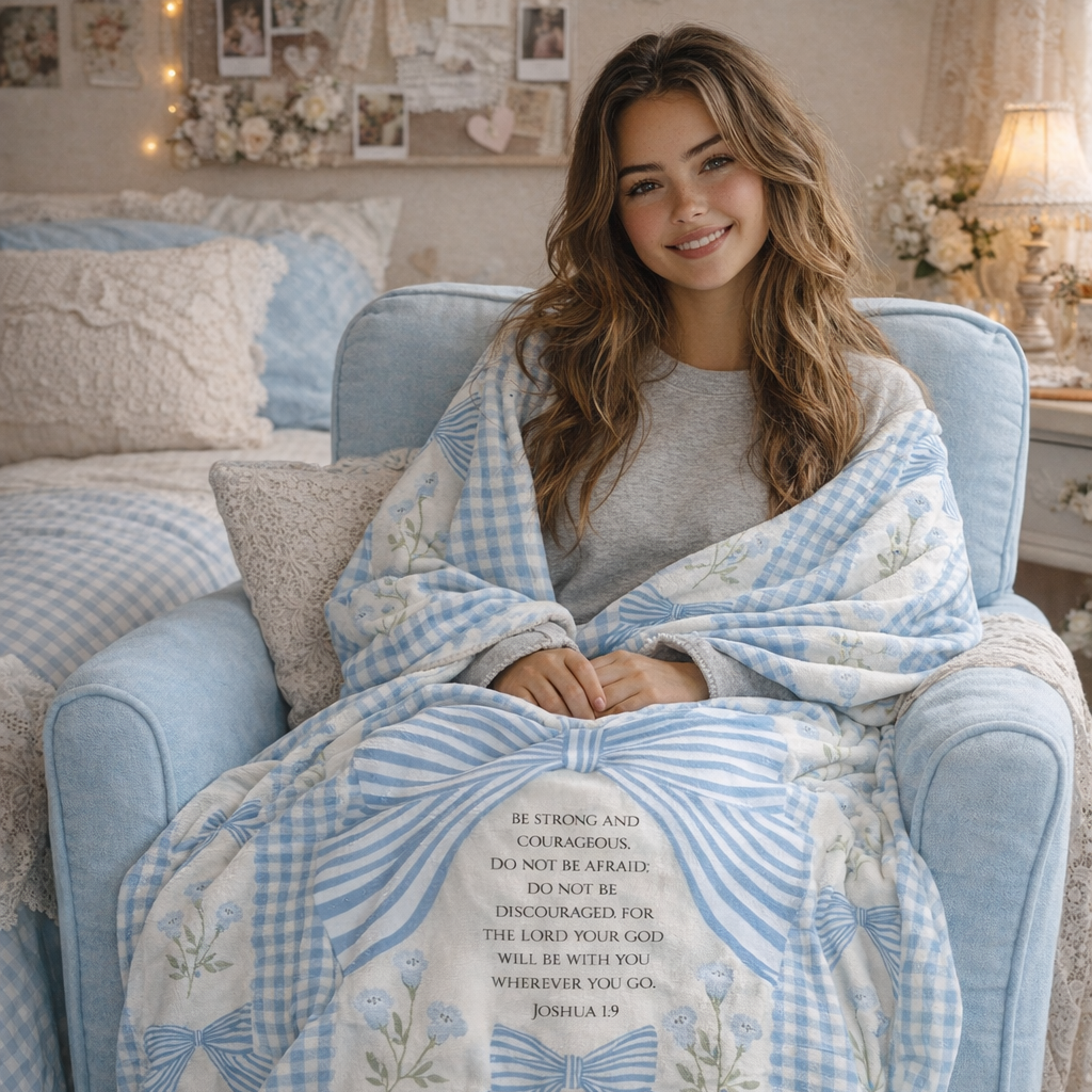 This cozy velveteen blanket features a soft, timeless blue gingham and bow design with Scripture woven into the heart of it - meant to remind her who she is, who she belongs to, and how deeply she is loved and prayed for.